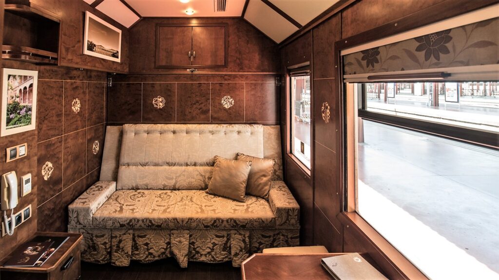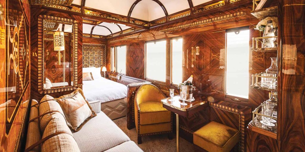 One of the world’s most exclusive luxury trains, Japan’s Seven Stars in Kyushu accommodates just 28 passengers per departure and books out years in advance. The seven bespoke carriages – five sleeping cars, a panoramic lounge and a salon car with tea room – are finished in deep wine-red livery with gold detailing, though the most sought-after accommodation remains the seventh car’s two deluxe suites, one featuring a large observation window.