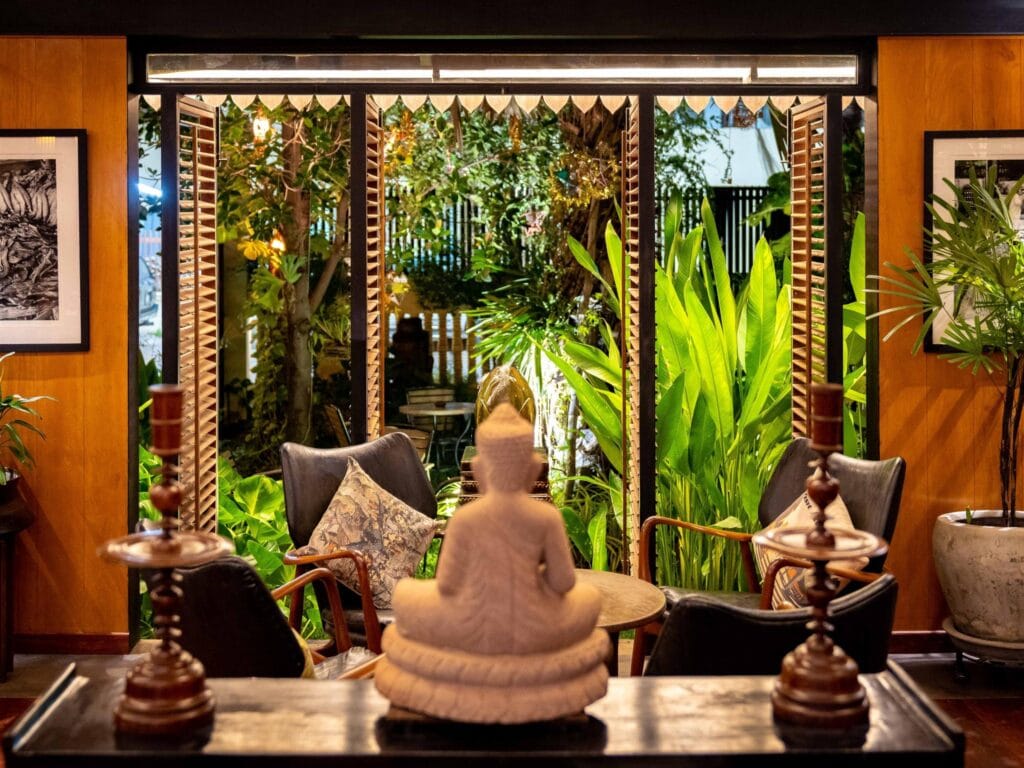 This longtime favourite of the late Anthony Bourdain is still one of Siem Reap’s most beloved dining rooms. The Sugar Palm serves home-style Khmer food in a traditional wooden villa, with dishes handed down through founder Kethana Dunnett’s family. Classics like Fish Amok is delicately steamed in banana leaves, green mango salads are sharp and bright, and everything arrives with genuine warmth. The airy upstairs dining room, with its high ceilings and spinning ceiling fans, evokes bygone eras.